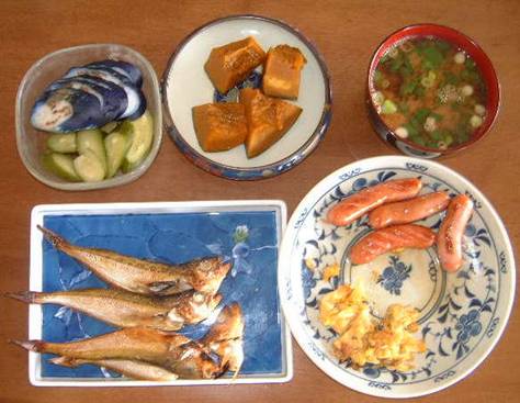 酒、醤油、みりん。タマネギとカボチャのみそ汁。はたはたのひもの。自家製ぬか漬け。