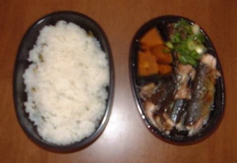 11日の残りのカボチャ。サンマの塩焼き。牛肉とタマネギの炒め煮。