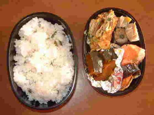 市販のシュウマイ。焼き魚は塩鮭、まだ残っているカボチャ、ネギとちりめんじゃこの入った和風オムレツ
