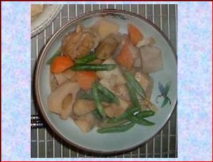 | 板蒟蒻 | 1/4丁(63g) | B京芋と薄揚げ、インゲン以外の材料を胡麻油で炒め、椎茸の戻し汁とだし汁を入れ、煮物のタレを入れて煮込む。 | ||||||||||||||||