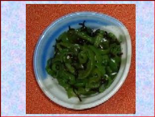@ピーマンを短冊に切って袋に入れてレンジでチン!して、熱いところに塩昆布を入れて振って混ぜて出来上がり。