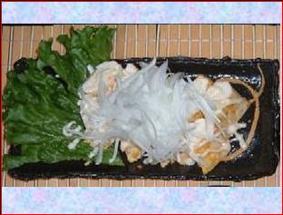 | サラダ油 | 小匙1杯(4g) | D濃口醤油を少したらし、上からゴママヨネーズと唐辛子をふって、上からBの玉葱を飾る。 | ||||||||||||||||